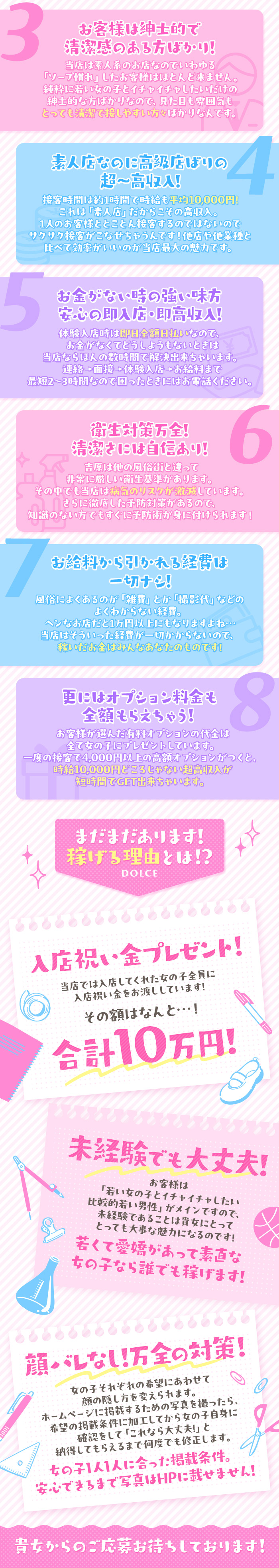 🌸 圧倒的学園系No.1!DOLCE吉原 🌸「どうせ働くなら、本当に稼げるお店がいい」そう思っている女の子にこそ知ってほしいのが DOLCE吉原。私たちはただの学園系ではなく、圧倒的な集客力とブランド力を誇る【学園系No.1】の存在です。⸻✅ 驚きの予約数!平日でもお部屋がフル稼働「平日はお客さんが少ないんじゃないの?」そんな不安は一切不要です。来店こそ少ないものの、予約がエグイんです。店頭で受け付ける事は滅多にありません。そんな時代なんです。つまり、OPENからCLOSEまで予約で空き部屋がほとんど無し。お客様の波がなく、平日でも常にフル稼働なんです。⸻✅ 閑散期ゼロ!常に安定して稼げる環境どんなお店でも「閑散期」や「暇な日」があると思われがち。ですが、DOLCE吉原には “暇”という日が存在しません。• 週末だけ盛り上がる…なんてことはナシ• シーズンによって売上が変動…なんてこともナシ一年中、毎日が繁忙期だからこそ、安定した高収入を誰でも実現できる環境が整っています。⸻✅ 安心して選ばれる「学園系No.1」の理由なぜこれほどまでに予約が絶えないのか?その理由は、DOLCE吉原が持つ 圧倒的なブランド力と広告力にあります。• ✅ 学園系に特化した確立されたコンセプト• ✅ 圧倒的な広告費で集客力が桁違い• ✅ 店舗数・系列実績による安心感と信頼これらが組み合わさることで、「とにかくお客様が途切れない環境」を実現しています。⸻✅ 働く女の子にとってベストな選択肢• 「今日は予約が入らなかったらどうしよう…」• 「安定して稼げるお店を選びたい…」そんな不安を抱える必要はありません。DOLCE吉原は、在籍する女の子全員が毎日稼げるお店です。「せっかく働くなら、No.1のお店で。」その選択が、あなたの未来を大きく変えます✨⸻💎 あなたの頑張りを必ず収入に変えるお店学園系で働くなら、迷わずDOLCE吉原へ。毎日が繁忙期。毎日がチャンス。あなたの努力が、しっかりお給料に直結する環境を、私たちはお約束します。ウチに来たからには100%稼がせます。まずはお気軽にご応募から♪このお店ちょっと気になる!と思ったらお気軽にご応募・お問合せくださいませ〜〜✨✨知名度+集客力抜群の【ドルチェグループ】で稼ごう!!《ドルチェ吉原 女性求人担当》LINE追加はこちらから(※18歳未満・高校生のご応募は不可)↓
