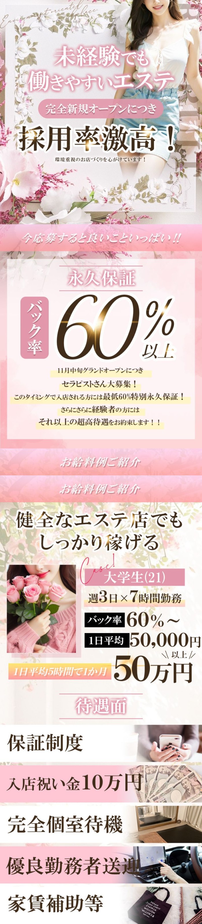 「メンズエステって本当に稼げるの?」「せっかく働くなら、しっかり高収入を得たい!」そんなあなたへ✨ 実際に 月収100万円以上 稼ぐ女性も多数!その秘密は…✅ 安定した集客力 → フリーのお客様多数!指名につながりやすい✅ SNS運用サポート → 効果的な投稿方法をレクチャー!✅ 出勤日数に応じた優遇制度 → コツコツ頑張る子がしっかり稼げる仕組み「人気がないと稼げない?」そんなことはありません!お店がしっかりサポートするので、未経験でも努力次第で高収入✨💡 遅刻・当欠なしで収入安定!✅ お店の信頼UP → フリーのお客様を優先的に紹介!✅ リピーターが増える → 安定した指名と収入UP!✅ 指名が増えると単価もUP → バック率もUP✨✅許可物件なので摘発の心配もなし!✅写真顔隠しOK・掲載前にしっかり相談本気で稼ぎたい方、今がチャンス!まずは気軽にお問い合わせください♪