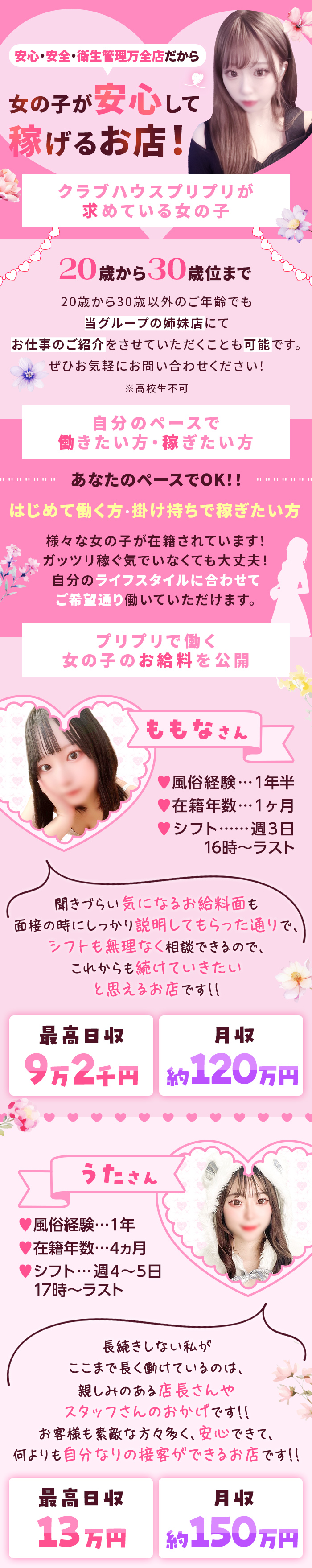 お店探しをしている女の子へ♡面接時に「この時間は足りてるから・・・」「年齢がちょっとウチだと高いかな・・・」と言われた経験ありませんか?プリプリでは、そんな心配はありません(`・ω・´)なんとお隣に・・・系列店があります!今回は、系列店のご紹介をちょこっとしたいと思います♪プリプリの特徴プリプリは基本的に20代前半〜中盤くらいの女の子が中心のお店になります。コンセプトもカジュアルや素人を売りにしているので、未経験の女の子が気軽に入店できる店舗なのが特徴です♡プレジャーの特徴プリプリのお隣に店舗を構えるプレジャーは、20代後半〜30代の女性が多く在籍している店舗になります!店内も落ち着いた雰囲気なので、お姉さんや大人っぽい方にピッタリです♡※もちろん20歳前後の女の子も大歓迎(*ˊᗜˋ*)/気になったら面接へ♡プリプリとプレジャー両方を運営する当店!合計で部屋数16部屋の大型店なので、出勤したのにお部屋に入れない(´•ω•`)ということはないので、安心です!お問い合わせお待ちしております♪
