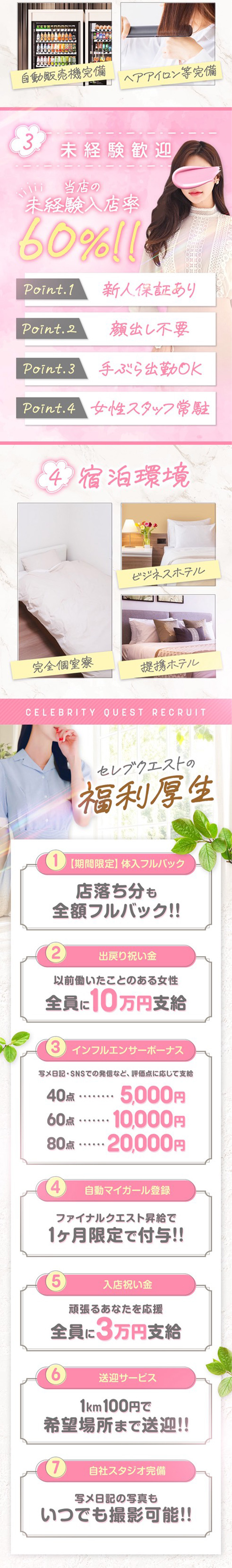 女の子のお仕事に対してノルマや罰金などがないお店だよ♪お店によっては、入店から◯ヶ月以降からはノルマが発生したり、無断欠勤などでは罰金になってしまうなどルールがあったりもするから、入店前にはしっかり聞いてみてね!