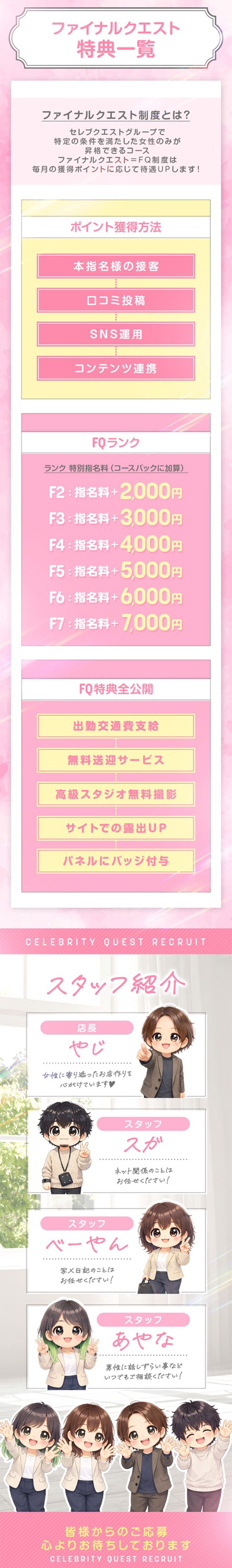 当店は、男性スタッフと女性スタッフが常駐しているのが当店の特徴となっております。 男性スタッフも、女性スタッフも、優しくて面白いスタッフばかりです! キャストさんが常に相談しやすく、話しやすく、安心して働ける環境となっております。