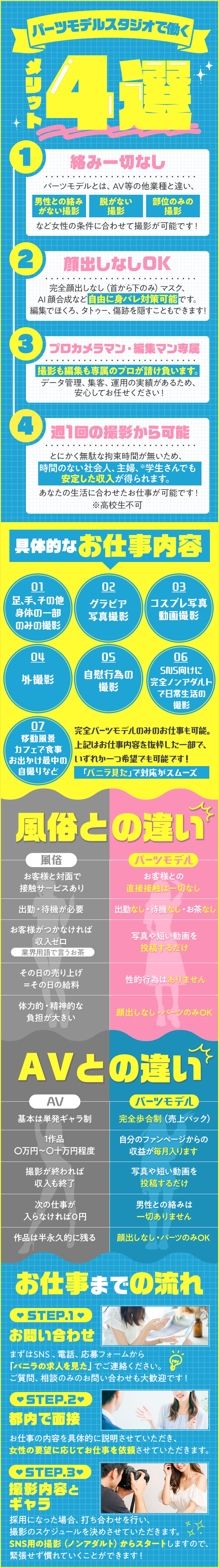 ★★触られない仕事だから安心★★「脱ぐ」と「触れられる」はまったく別のお仕事です。「夜系の仕事って、結局エッチなことするんでしょ?」そんなイメージを持たれてしまうこともありますが実は働き方によって大きく違います。私たちが大切にしているのは完全非接触というスタイルです。当スタジオはあくまで“撮影”のお仕事。接客はありませんし、触れられることもありません。カメラ越しにパーツや雰囲気を作品として残す、それだけです。撮影後に嫌な気持ちが残らないこと。それが長く続けられる一番の条件だと考えています。★撮影内容は事前に明確に★「聞いていた内容と違う」そんな思いをさせることはありません。そもそも、絡み撮影のメニューは存在しません。撮影は事前に内容を確認し、同意した範囲のみで行います。無理なお願いや当日変更もありません。★モデルとして働くという選択★身体の一部を素材として撮影することは立派なモデルのお仕事です。サービス業とはまったく別の働き方です。私たちは・接触なし・強要なし・騙しなしこの3つを徹底しています。不安があるのは当然です。だからこそ安心できる環境をきちんと説明することを大切にしています。まずは話を聞くだけでも大丈夫です。あなたが納得したうえで選べるよう、丁寧にご案内いたします。