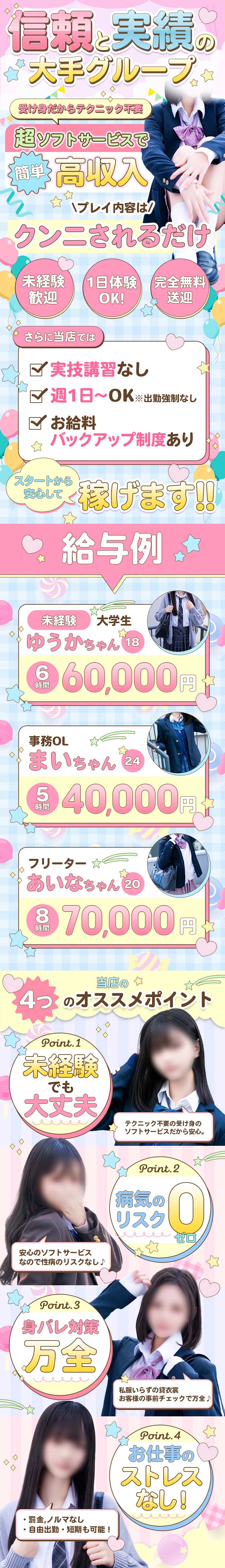 大手グループが経営しているお店だよ。待遇や条件も手厚くて安心だし、集客力もあって女の子が稼ぎやすい!待遇や条件はグループの中でも店舗ごとに変わってくるから、気になるポイントは問い合わせて聞いてみよう♪