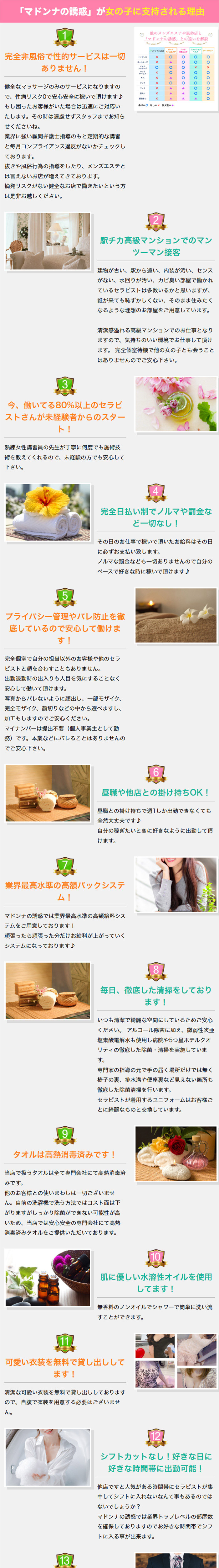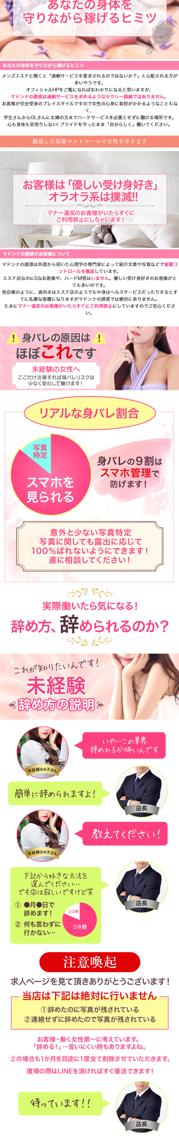 Q、以前お客さんの自宅で怖い思いをしたことがあったのですが、そういうときにはお店はどういった対応をしていただけるのでしょうか?A、・当店はお客様にセラピストさんが待機している部屋にお越し頂くタイプなので派遣自体がありません・もし何かあった場合もすぐに駆けつけます当店は自宅派遣は一切やってないお店です。近場のホテルに派遣することもなく、どの部屋でどのセラピストさんがどのお客様を接客しているかを把握しております!基本的にはルールを守っていただけるお客様がほとんどでですが、まれにトラブルに発展する場合もございます。その際はすぐにスタッフが駆け付けますので大きなトラブルになったことは過去になくそういったお客様も出禁にしてお店の風紀を守ってます。全てのセラピストさんに安心して働いてもらえるよう環境を整えておりますのでマンションタイプのお店でしっかり頑張りたいセラピストさんぜひお待ちしております♪もちろん派遣タイプで頑張られている方の掛持ち先としても当店はおすすめですよ★✨✨✨ 稼ぎたい30~69歳を大募集 ✨✨✨「マドンナの誘惑」はキス、フェラ、お触りといったハードなサービスはオプションも含めて一切ございません。LINEID:madonnanoyuuwaku簡単LINE追加:https://line.me/ti/p/Br-MtYFquKお気軽にお問合せお待ちしております♪