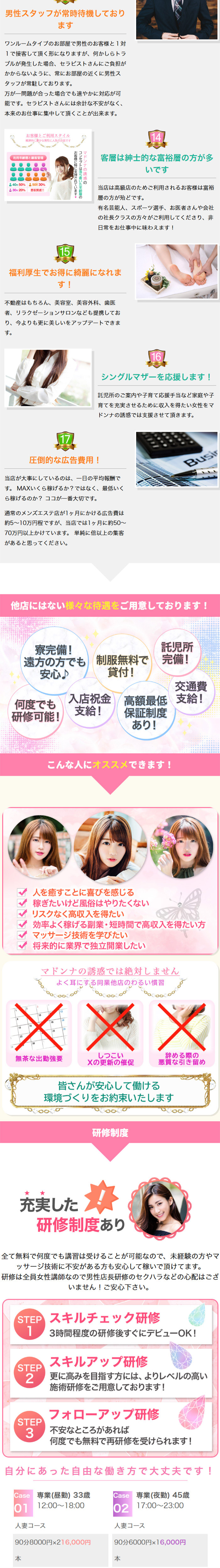 麗しいマダムでは… ○脱ぎなし・舐めなし・お触りされない完全非風俗 ○業界トップレベルの高額バックシステム ○高級マンション内の完全個室での待機&施術(他の女性に会うことはありません) ○スタッフが常に近くに常駐していますので、何かあればすぐに駆けつけます ○無料でプロ講師の講習を何度でも受けられますので、 未経験の方でも安心安全にお仕事デビューが可能です 『人妻専門メンズエステで働くなら麗しいマダム』と言い切っていいくらい 恵まれた環境でお仕事して頂けます♪ ぜひお気軽にご応募・ご連絡ください!