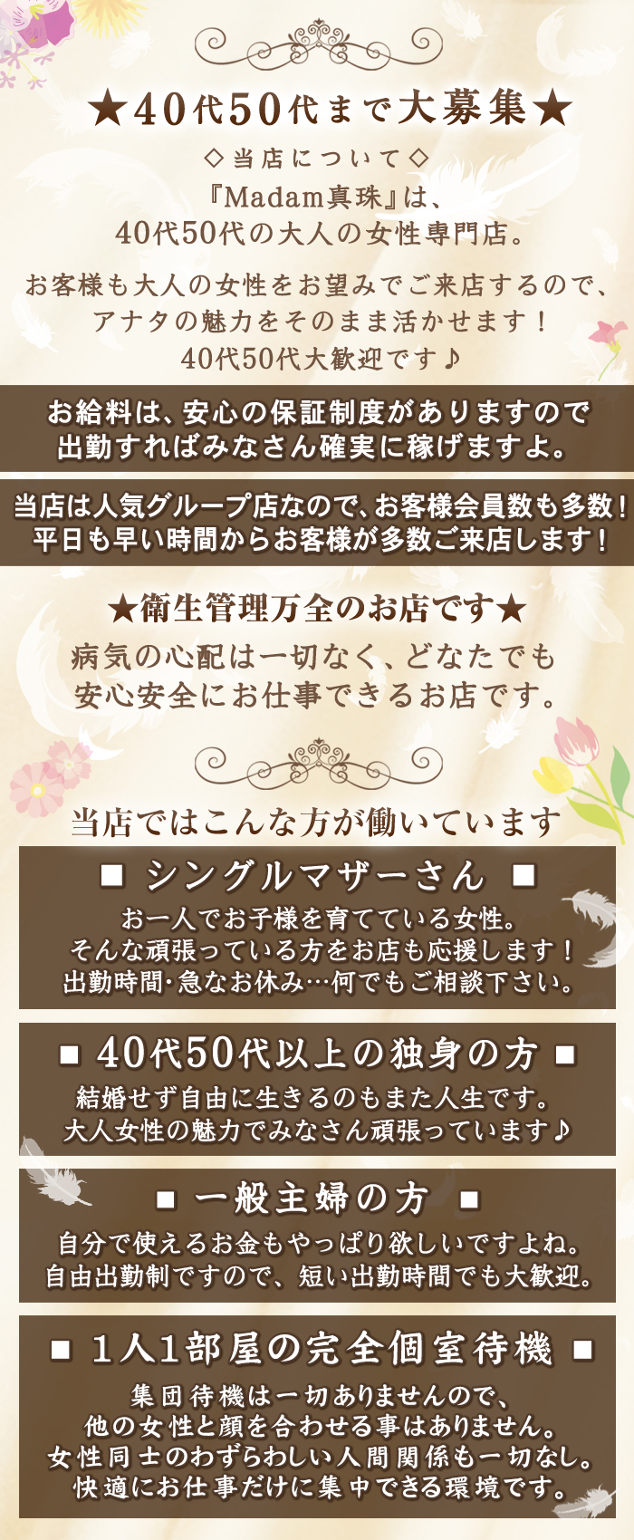 当店は、40代50代以上の大人の女性専門店です。 シングルマザーさん・主婦の方、独身さん、みなさん大募集です! 年齢は気にせずお気軽にお問合せ下さい♪