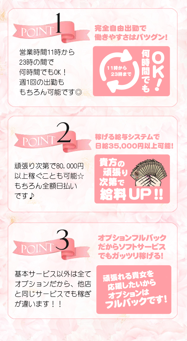 よくあるご質問でソフトサービスだとそんなに稼げないんじゃ?という質問をいただきますが・・・心配無用です!当店はオプションフルバック!だからソフトサービスでも皆さんガッツリ稼いでいただいてます!勿論、出来ないオプションは無理強いしません更に雑費などの引かれ物も一切御座いません!あなたも100万円プレイヤーの仲間入りしませんか?面接は随時受け付けていますのでお気軽にご応募下さいませ!スタッフ一同お待ちしております!