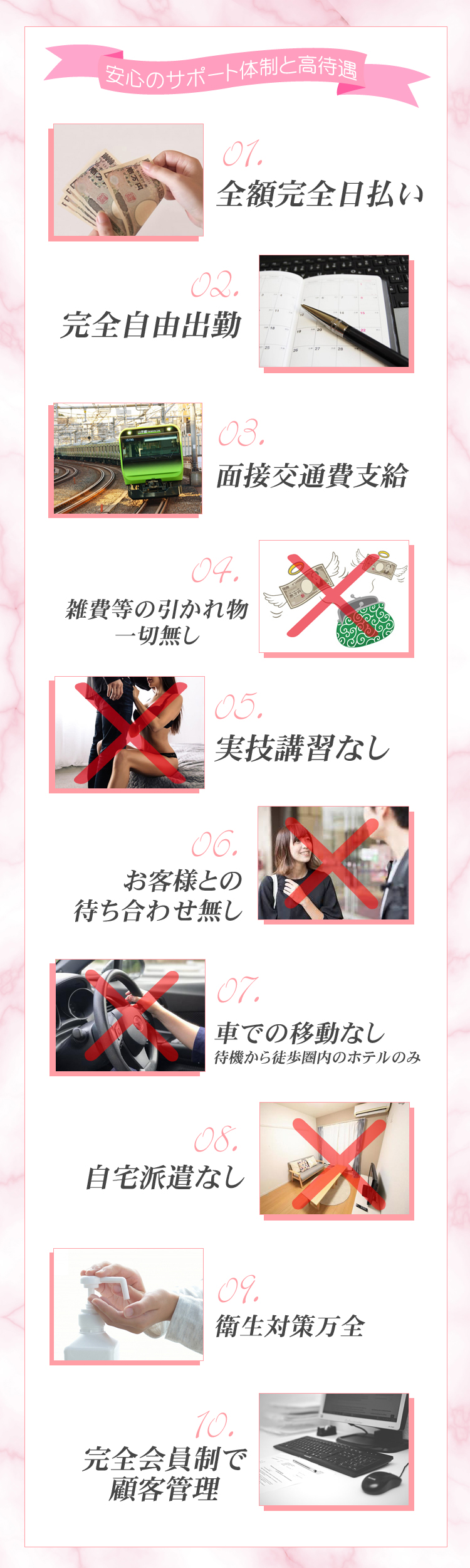 ■脱がない・触られない ■お顔出しNGの方でも大丈夫 ■お仕事道具貸与 ■お仕事内容の可能・不可能は個別に対応 ■秘密厳守(バレない対策・個人情報保護万全) ■衛生管理万全 ■他店との掛け持ちOK ■アルバイトOK ■罰金等なし ■最低保証あり 上記にないご要望等ございましたらお気軽にご相談下さい。 |