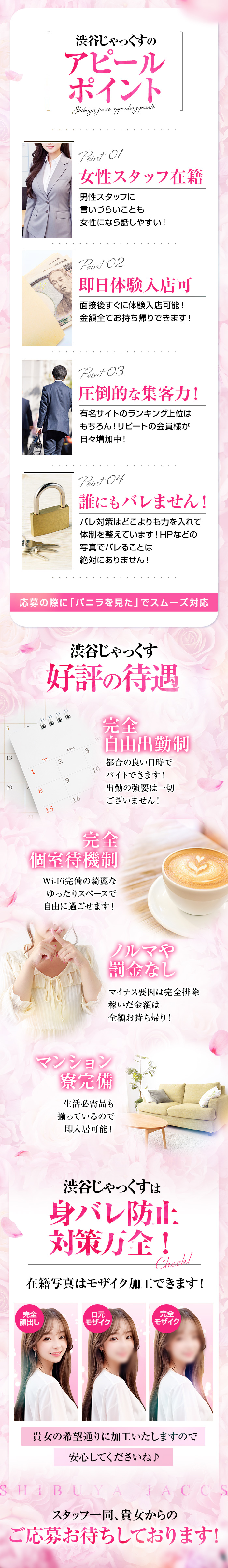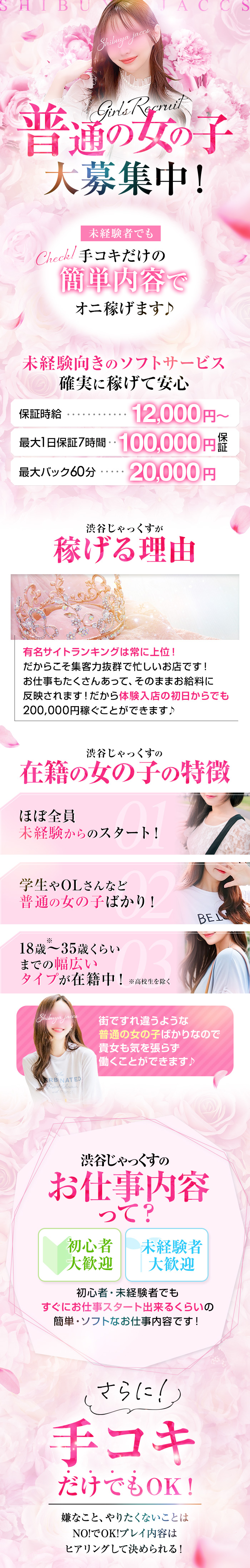 ★1日体験入店・最大20万円保証=未経験者でも☆手コキだけでも☆高額支給! ★60分バック最大3万円 ★入店祝金100万円[コロナ禍限定THANKSキャンペーン中] ★集客用有名某サイトランキング常に上位の「渋谷じゃっくす」だからできる高額の給与提示です!