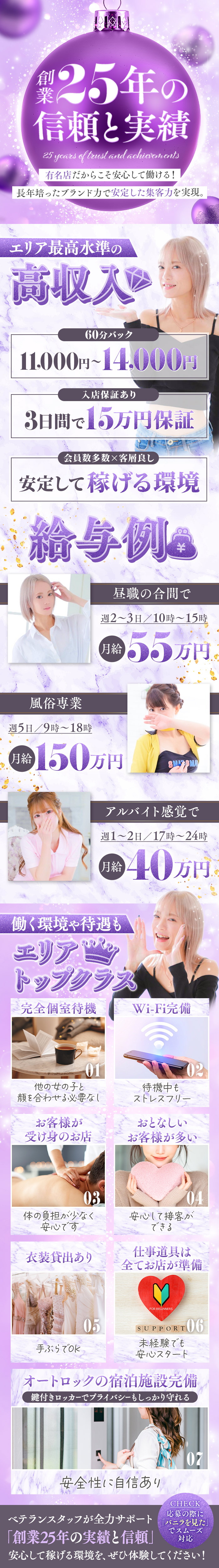 初心者でも安心 当店は『風俗営業届出済店』。 『未届出店』が摘発されて働いている女の子が取り調べをうけるなんてこともありません。 店舗型のお店なので、いつもスタッフが近くにいます。 泥酔客、挙動不審者や過去のトラブルで出入り禁止になった客などは受付もできませんので、怖いトラブルなど一切ありません。 どうしてそんなに稼げるの? 広告費用は業界トップクラス!ネット広告にも力を入れています。 優秀なスタッフが数名体制で日々、新規集客に取り組んでいます。 このノウハウは当店独自のもので、常に新しいお客様の問合せが絶えないのです。 また当店は業界トップのバック率です。指名ノルマ・罰金も一切なし。 頑張るあなたを完全サポートします。 働く女の子のことを第一に考えて、環境を作りましたホームページやお店の顔見せはNGでも大丈夫です。 それでもしっかり指名がとれる位お客様が来店しています。 接客中にNG行為があれば、すぐにサービス中止のうえ出入禁止!! 電話番号をしつこく聞く人や店外デートなどを誘う人もNG! ストーカー行為などには専門弁護士を使って徹底的に闘います。