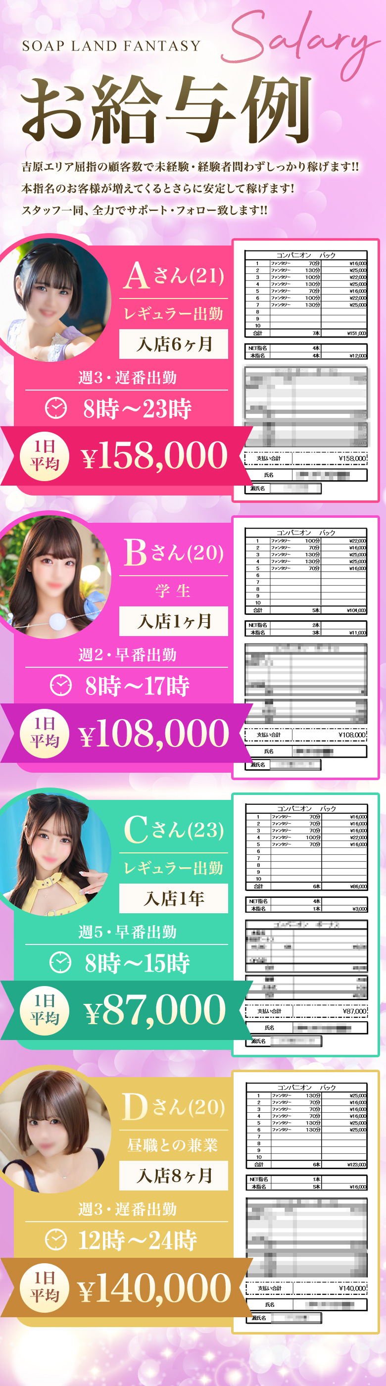 ワンランク上の生活を手にするならFANTASY! 10年以上続く老舗の安心・安定感 キャストファーストで月2回の検査代無料、撮影代初回無料。 貴女の輝けるステージをご用意しております