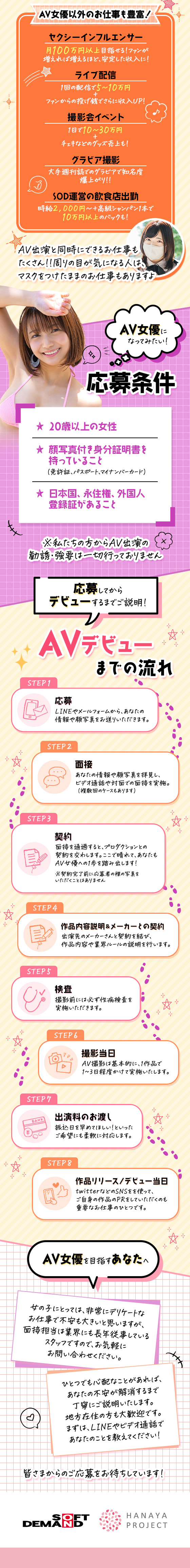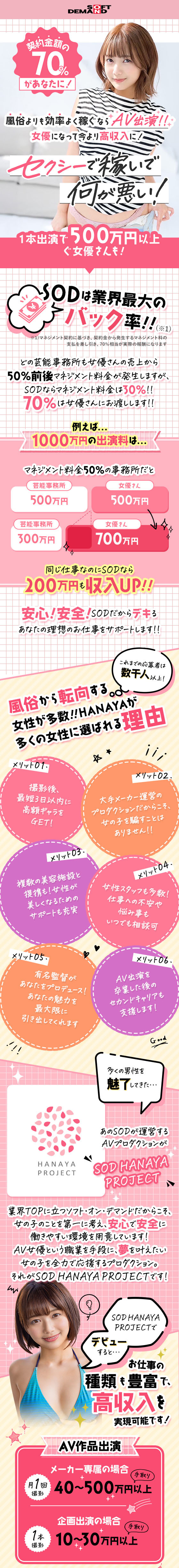 マジックミラー号でも有名なSODが運営するプロダクション! 20代を中心に、多数の女優・モデル・インフルエンサーが活躍中です!あなたがどんな風に活躍したいかをお聞きして、その夢を実現するためのサポートをさせていただきます!