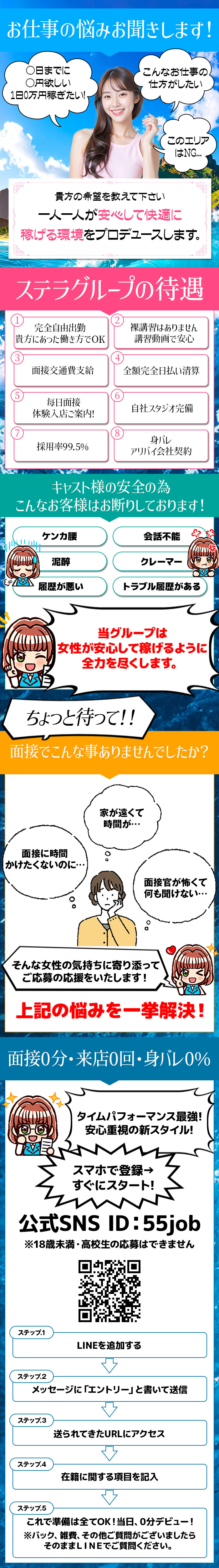 🌸 顔出しは必要ですが、LINEビデオ通話で安心して話せます— WEB面接が不安な方へ、詳しくご説明します —ステラグループ千葉では、来店面接に加えて**スマホひとつで完結できる「LINEビデオ通話でのWEB面接」**を導入しています。最近は「外に出づらい」「子どもがいて移動が難しい」「まずは家で話したい」そんな声も多く、WEB面接の利用が非常に増えています📱✨ここでは、より安心して受けてもらえるように、“顔出しありのWEB面接”がどんな仕組みで、どう安心できるのかしっかりとお伝えしていきます。🧡 ① 顔出しが必要な理由と、その安全性についてWEB面接では、基本的に顔出しをお願いしています。これは、店舗側が「きちんと“応募者本人”と話ができているか」を確認するためです。しかしご安心ください。顔を映していただくのは “スタッフとの1対1のみ”。録画は一切行いませんし、画像が外部に出る可能性は完全にゼロです。 通信はLINEの暗号化システムで安全 録画・保存はもちろん行わない 第三者が映像を見ることは絶対にない 「本当に守られるの?」という不安が消えるよう、プライバシー管理は徹底しています。☺️ ② メイクなし・部屋が散らかっていてもOKWEB面接は“おしゃれして来てください”というものではありません。 すっぴんのまま 部屋が映らない角度に調整 パジャマ・部屋着でもOK お子さんが近くにいても大丈夫 画面に映るのは顔と少しの背景だけ。必要ならこちらで角度のアドバイスも行いますので、気にしすぎなくて大丈夫です。💬 ③ 対面より「言いにくいこと」が話しやすい実は、WEB面接を選ぶ方の多くがこう言います👇「対面より、画面越しの方が気楽で本音を言いやすい」・お金のこと・家庭や子どものこと・身バレの不安・働ける時間が短い悩み・初めてで怖いという気持ちこういった本音の部分こそ、WEB面接の方がゆっくり話してもらいやすいんです😊私たちも、緊張せず自然体で話せるよう柔らかい雰囲気でヒアリングしています。🏠 ④ 移動不要・待ち時間なしでラクに受けられるWEB面接を選んだ方のメリットはとても大きいです👇 家から出なくてOK 子どもが寝ている間に受けられる 仕事の休憩時間でも可能 移動時間や待ち時間がゼロ 身バレのリスクもまったくない 「まずは話だけ聞きたい」そんな軽い気持ちで受けられるのが魅力です。🌸 ⑤ 無理な勧誘は一切なしWEB面接だからと言って、「今すぐ来てください」「今日働きませんか?」なんて無理な誘導は一切ありません。むしろ、説明したうえで… もう少し考えたい 家族と相談したい 来店は別日にゆっくりで …という選択をしていただけます。あなたのペースでOKです🍀強制・圧はゼロですので、気軽に受けてください。🌈 まとめWEB面接は**“お店に行く前に、気になることを全部スッキリさせる時間”**です。顔出しありではありますが、1対1・録画なし・プライバシーは完全に守られる形で行っていますので、安心してお話しできます。「行くのはちょっと緊張する…」そんな方こそ、ぜひWEB面接をご利用くださいね☺️