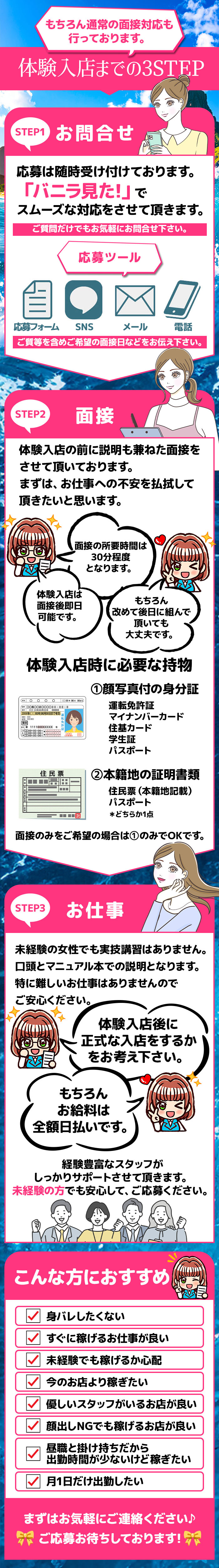 面接のゴールは“採用”ではなく“安心” 私たちは合否をつけるためではなく、あなたの希望と不安を整理する時間として面接を行います。 服装自由・履歴書不要。所要20〜40分目安、途中でやめてもOK。 プライバシーの守り方 個室または静かな個別ブースで実施。周囲に聞こえません。 共有する情報は必要最小限。本名や住所は任意、メモは社内で厳重保管/不要分は破棄。 面接だけ受けて連絡停止も選べます(その場でデータ削除対応)。 話せるテーマ例(何でもOK) 💰 お金:目標額/日払いの流れ/天引きの有無/交通費 🕶 身バレ:顔出し可否/掲載範囲の制限/知り合いブロック 🗓 シフト:週1・短時間/家庭・学業優先/急なお休み 🧡 体調・メンタル:無理NGプレイ/しんどい日の対応/女性スタッフ相談窓口 その場でできる“見える化” バック表の実数字を見せて説明(60分○○円→手取り△△円)。 顔出し無しサンプル写真、加工パターンをその場で提示。 希望条件をチェックリスト化して控えをお渡し(後で再検討OK)。 即決しなくて大丈夫 「今日は話だけ」でOK。体験入店も別日予約で可。 ご自宅でゆっくり読める面接メモ(持ち帰り版)をご用意。 迷った時は「保留」を選択。連絡方法もあなた主導で決められます。 ミニQ&A Q:守秘は本当に大丈夫? A:面接記録は限定権限で保管、第三者共有は一切なし。退店・辞退時は削除可能。 Q:断りづらくなりませんか? A:勧誘・圧はゼロ方針。その場で「やめます」で終了OK。 Q:子ども連れでも? A:短時間・オンライン面談も可。時間帯も柔軟に調整します