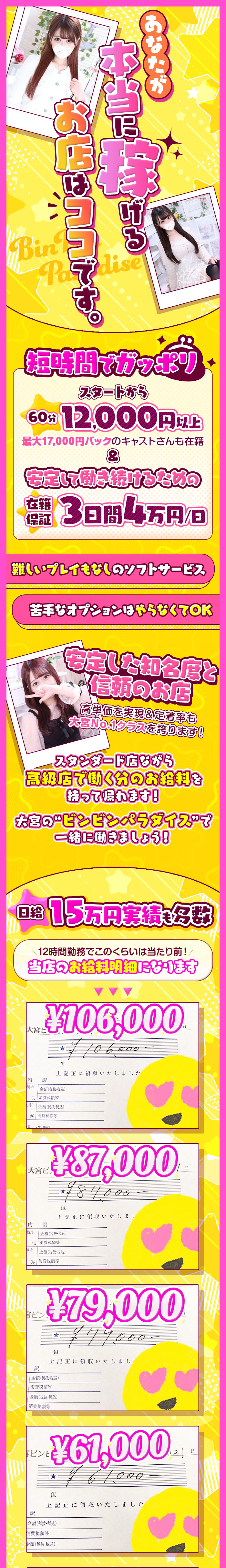 お客様が全然付かなかった場合でも一定の金額分をお店がお給料として保証してくれるシステムだよ♪「全然稼げない!」という心配がないから嬉しい待遇だね!お店によってルールに違いはあるみたいだから詳しく聞いて確認してみてね☆