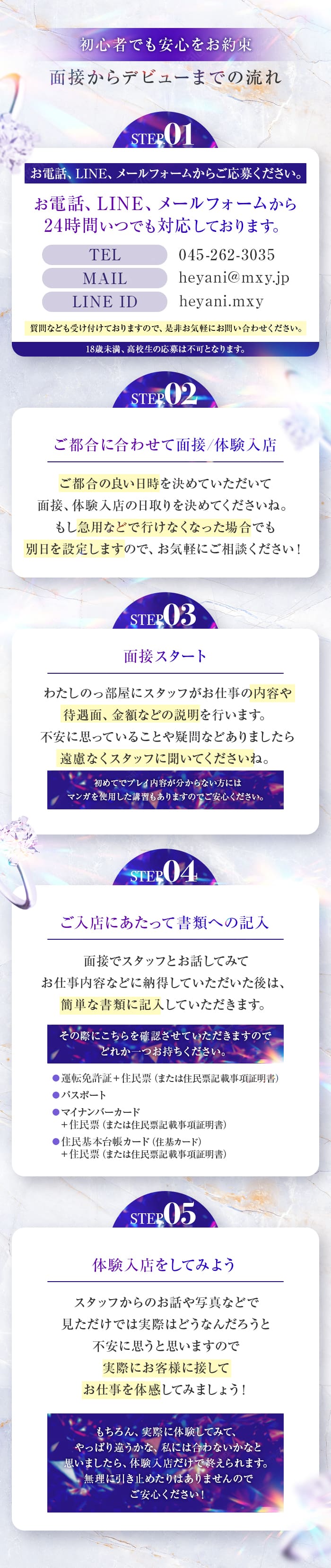 的確にお答え出来るかは不安ですが、怖い印象は誰しもがそうだと思います!私自身もそうでしたが働いている女性の方々を見ていると夢や目標を持った普通の方ばかりです。身バレ防止につきましては、事務所での対応ができますのでご安心ください。 仕事内容も在籍の80%は未経験からのスタートです。大丈夫ですよ。 期間限定もOKです!