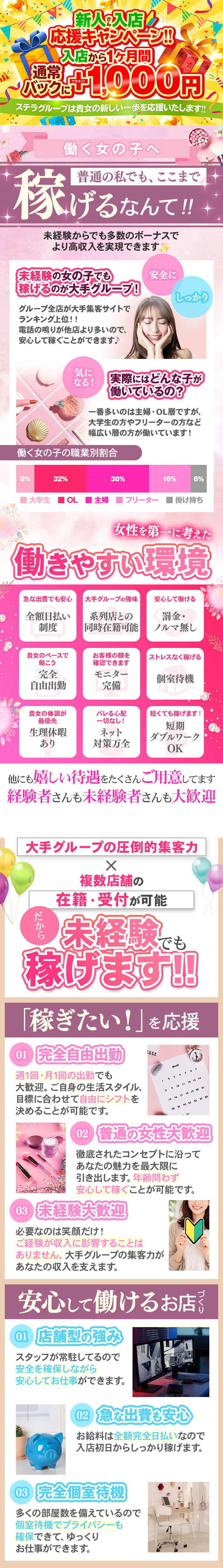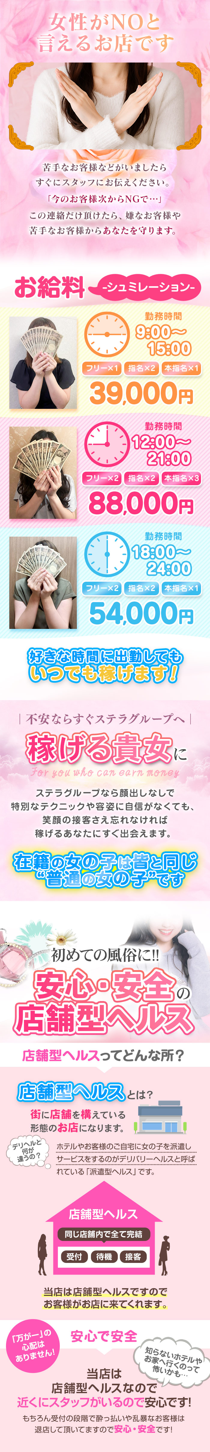 ステラグループ全体で創業20年! 抜群の実績と圧倒的な会員数であなたの稼ぎをバックアップ! 「もう少し稼ぎたい!」と思っているあなた! お店が合っていないのかもしれません(¨! 働きやすいし、スタッフさんもいい感じだし、何より新しいところに行くのが面倒くさい!なんて思っていませんか? もちろんそれでも良いですが、もっと輝ける場所が必ずあります! お客様に支持されているお店は、女の子にも支持されていることがほとんどです。女の子がいないとお客様がたくさん入ることはないですから! もちろん長く経営をやっていることがすべてではありません。 長く人気店であることがお客様が多く稼ぎやすいお店の条件になります。 20年営業してきて、常に人気店であり続けてきております。 この実績とお客様会員数が女の子にとっては『魔法』のように働きやすいお店となります! 当店は、ハードな接客やオプションは全く不要です。 愚直に正直にまじめに営業をして、多くのお客様に支持されております。 ハードサービスで成長をしてきたお店ではございませんので、お仕事内容もソフトで働きやすいです! お問い合わせやご質問だけでも大丈夫ですので、まずはご連絡をください! お待ちしております!!