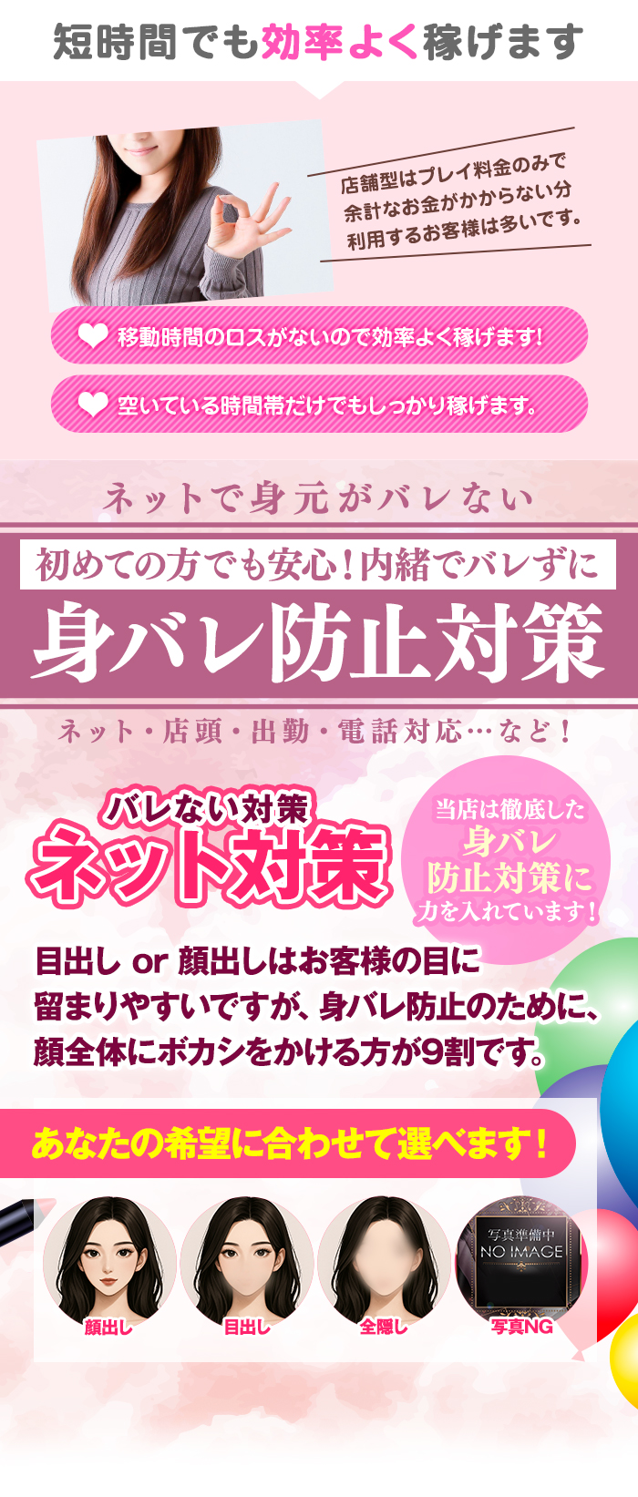 当グループで働く女性のうち、身バレ対策をを最重要視する方は多くいらっしゃいますが、店頭写真やホームページ写真の公開・非公開の選択、出勤時間のネット上と実際のものを調整したり、避けるべき特定の人物がいる場合はお店全体で把握したうえで来店がないように防ぐなど、あらゆる手段を最大限に活用しながら、女性の身バレ対策をおこなっております。 また、店舗型ヘルスという形態を活かしながら、実際に接客が決まったお客様を防犯カメラを使って事前にチェックするといったシステムもございますので、安心して働くことのできる環境がございます。