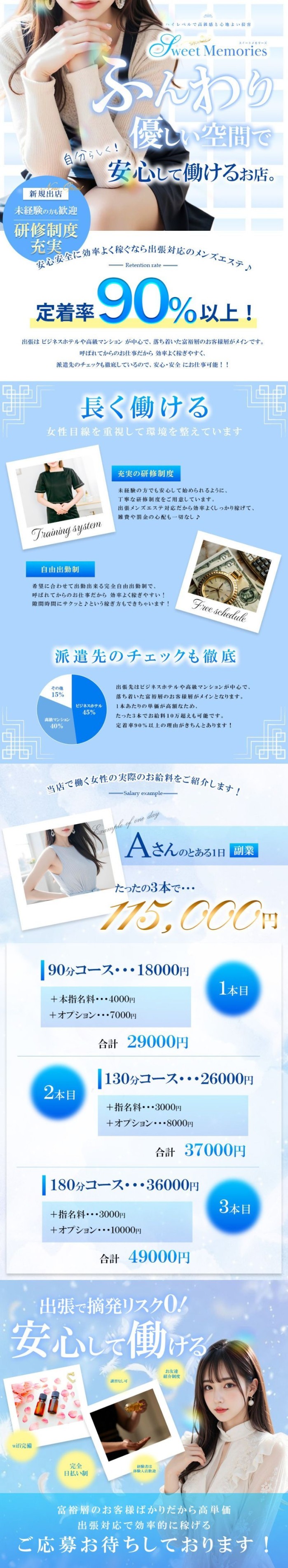 健全店なのに1日5万円以上、余裕! 安心・安全に思いっきり稼ぎましょう♡麻布・六本木エリアのお店で働きませんか?グランドオープンにつきセラピストさん大募集中です!当店は「店舗&ホテル出張型メンズエステ店」です。・出張先はホテルのみ・掃除洗濯一切なし・好きな時に好きなだけ出勤O K・かけもちOK・未経験OK 自由に安心して働けます♪(自宅への出張はお断りしております。)詳細について詳しく知りたい方は、面接の時にもご説明させていただきます♪ 女性講師が丁寧に指導・サポート致しますので、未経験でも安心してお仕事できます!! 興味のある方は是非ご応募お待ちしております(*^▽^*)