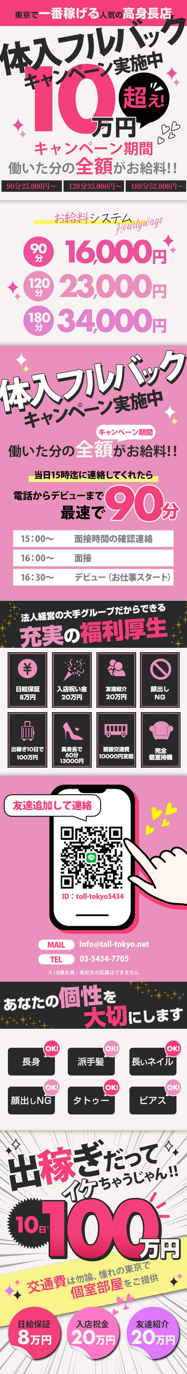 1日10万円オーバーは当たり前!! 今や東京!イヤ関東を代表する 【高身長デリ】の代名詞!TALL 高額なバックは当たり前! 他店よりバックが低い時はお伝えください! ※各種手当もご用意しております! 特に取材OKな方は更に破格の待遇で一撃!! |