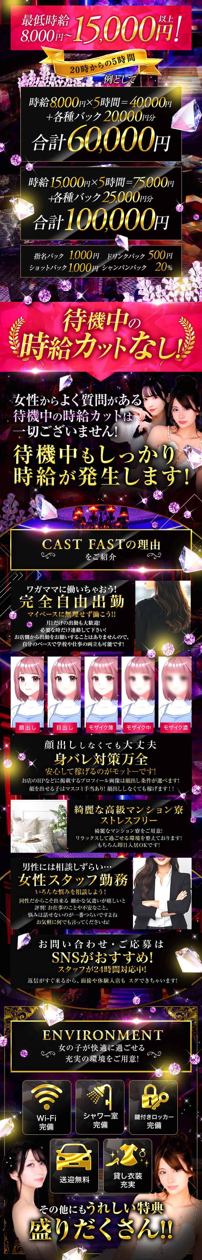 「通うには遠いな~」とか「引っ越ししたいな~」そんなときでも、お店が契約しているマンションを寮・宿泊施設として用意をしてくれるよ☆だから面倒な手続きもないし、家賃が無料や格安で、支払いも給料引きだったり融通が聞くから、必要な人は詳しく聞いてみてね♪