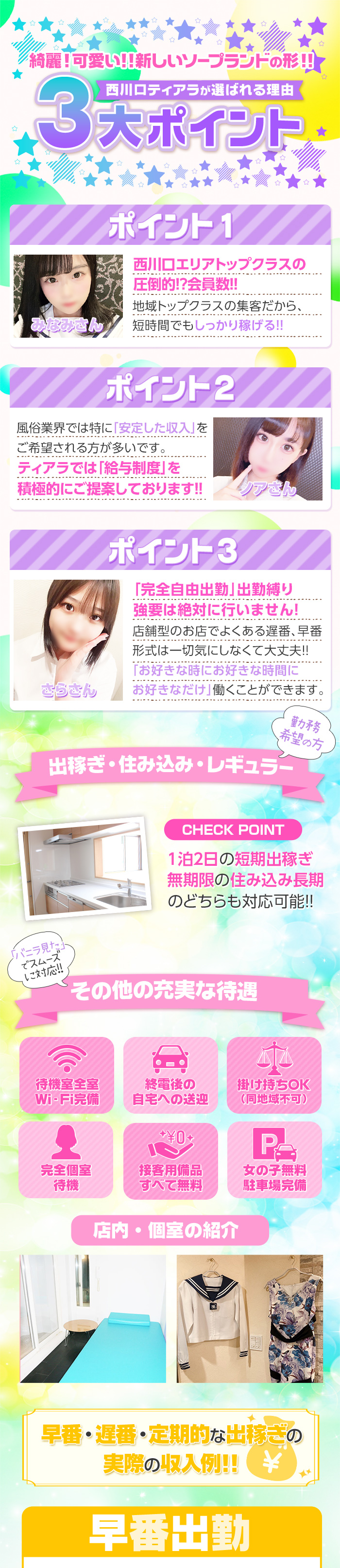 ソープデビューは在籍の8割が未経験スタートの当店にお任せ下さい! 常駐する女性スタッフが口頭にてしっかりお仕事説明してからのデビューとなり、しかも体験入店は最低5万円からのお給料保証もあり!! その他好待遇でお出迎えします。 ・10代未経験は超優遇します ・18~23歳大歓迎 ・もちろん経験者も大歓迎 ・早番(特に7時スタート)で働ける方超優遇 ・遅番、LASTまで働ける方も超優遇 ・最大保証10万円!!即日入寮有り☆ ・面接⇒お仕事スタートまで最短1時間半! ・無料駐車場完備!! ・出稼ぎ長期、短期も大歓迎!!(*^^*) [その他特典も多数ご用意] ・未経験者大歓迎 ・完全個室待機 ・備品は無料 ・フリーWi-Fi完備 ・終電を逃した女の子はご希望場所までの送り有 ・撮影費用無料 ・寮完備(家具家電完備、即入寮可能) ・ノルマ、罰金一切なし 安心してお仕事に取り組める環境が整っております!!