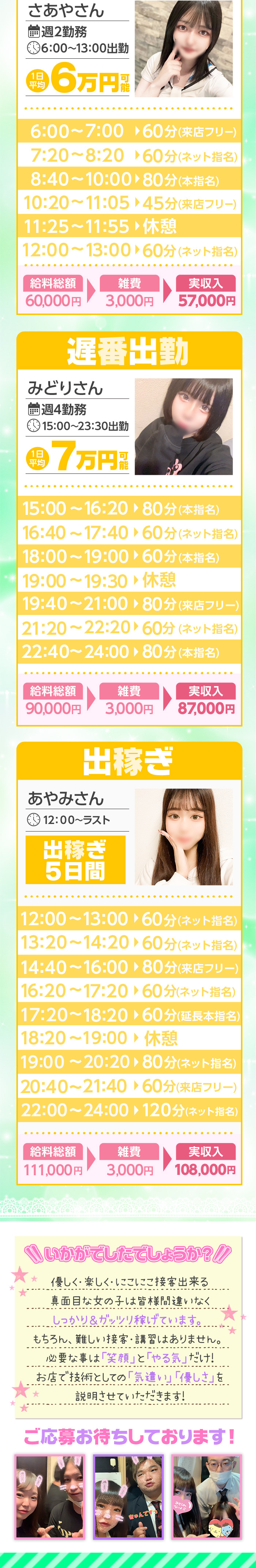 副業やWワークを歓迎しているお店だよ。時間が許す限りガンガン働いていお金を稼ぎたい女の子にはありがたいよね。シフトの入れ方にはお店ごとに決まりがあるから、詳しい条件は問い合わせてみよう♪