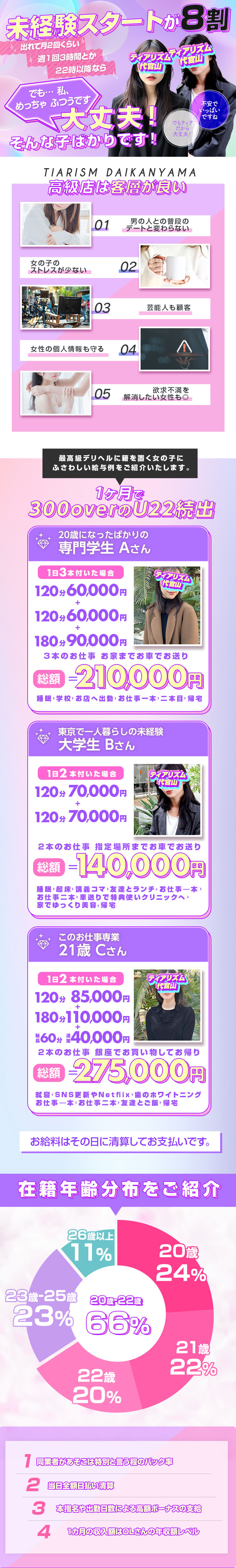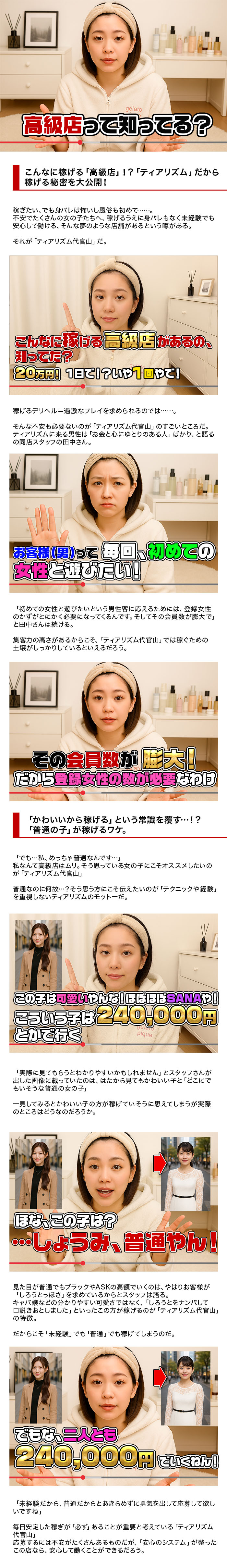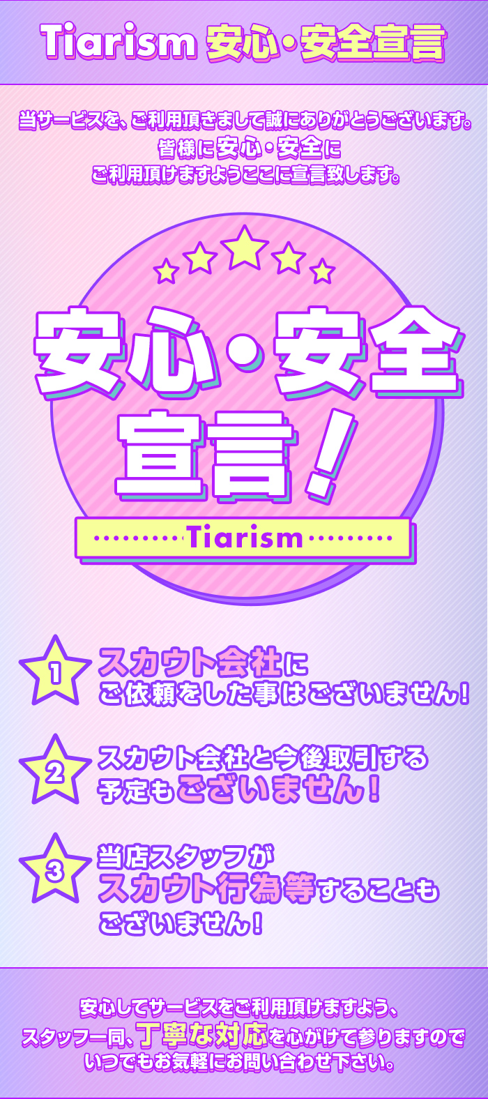 ~ティアリズム紹介~業界未経験の女の子も活躍できるお店です。幅広い女性が在籍してますのでお気軽にお問合せしてください♪♪ご質問が多いトップ3♪未経験でも働けますか?もちろん未経験でも働く事は可能です。最初は不安ですよね。。でも当店は未経験の女性にも安心して働いてもらえるよう面接の段階でじっくりお話をさせて頂いて不安を解決してからお仕事に行っていただきます。不安なことななんでもご相談ください。すぐに働きたいです。当店は面接終了後からすぐに働く事ができます。急にお金が必要になったなど飛び込みの面接でも大丈夫ですので遠慮なくお問い合わせ下さい。お給料について当店では当日全額手渡しになっておりますので急な出費などにもご対応できるかと思います!出勤自体が自由出勤になりますのでご自身の必要なタイミングで出勤していただければと思います。面接時にも詳しくお話ししますので是非一度面接にお越しくださいませ(^^♪