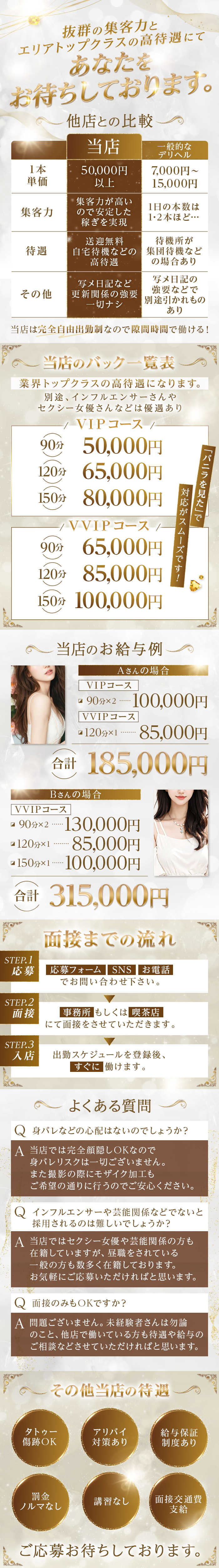 場面対応可・完全自由出勤・自由待機・自宅待機・即日採用可・即日体入可・即日払い・個人情報厳守・高単価・ハイレベルな客層・本指名推奨・店外デート可・送迎無料・タクシー移動可・掛け持ち可 |