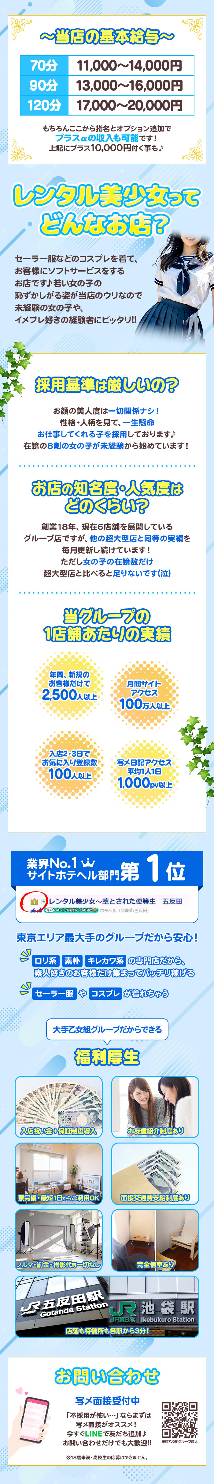 他にも制服を着た学園系のお店が沢山ある中、なぜ当店は群を抜いてバズっているのか…?その理由を特別にお教えいたします!①通常コースに沢山オプションが付いている当店の基本プレイには「セーラー服」「アイマスク」「手枷(てかせ)」「電マ」の4つが既に含まれています!他店だとこの4つを別途オプションで付けるとそこそこな金額になってしまいます💦なのでお客様は「めっちゃお得!」と感じるのです✨②現代のお客様ウケする女の子を揃えているお得感も大事ですが、実はこれが最も重要でお客様から支持されている理由です✨当店の女の子のコンセプトは「ロリ系・素朴系・素人系・キレカワ系」の専門店なのですが、その中でも「受け身が好きな子」「従順そう」「マジメそう」「性格良さそう」な女の子しかいないんです!ただし女の子の性格が皆一緒…という意味ではなく、他店ではギャル系やパリピ系など様々な女の子が在籍していたり責めが得意な子もいたりしますが、当店は「受け身好きの素人っぽい子」しか在籍していないんです♪とっても簡単に言うと、「ギャル系専門店とは真逆のお店」ですね✨時代は「黒髪清楚」の女の子が好まれてギャル系のお店は本当に少なくなりましたし、昔より「常識的、性格良い」人が大変好まれて「非常識」な人はすぐ炎上する世の中なので当店はいち早く流行りの専門店を作りました♡③現代の流行りの写メ日記を書いているせっかくコンセプトがあるお店なのに、別キャラのような写メ日記を書いてはお客様から「実際はコンセプトと違う子かも…」と疑われて予約が入らないので、写メ日記もコンセプトに合わせています✨例えば「高級レストランで食事したよ!」「ブランドのバッグ買っちゃった♪」などの題材は素人っぽくないですよね笑では「今○○っていうアニメ観てます」「スシローのマヨコーンが好きです」というタイトルだと、どうでしょう?普通の素人っぽい子に見えませんか?✨ただし当店だけではなく、専門店を除く他のお店でも現代はこのような日記がお客様ウケするんです!当店のスタッフはお客様ウケする写メ日記の書き方を熟知しているので一から丁寧にお教えする事ができます♪④スタッフが普通に丁寧接客お客様もご来店時に「怖い人が出てくるんじゃ…」「裏社会の人と繋がってるんじゃ?」という、昔からのイメージがあって不安を感じています💦当店は見た目からして普通のスタッフで丁寧接客を大切にしています✨また前職が「高級料理店の責任者」や「人材コンサル会社」だったりと他の社会経験もシッカリあるスタッフしかいません♪まとめ:流行りをキッチリ貫いてるだけのお店「専門店」という言葉を聞くと、女の子の採用基準が厳しかったり一部の少ないお客様にしか刺さらなかったりというイメージがある方も多いと思います💦ただ、もうお気付きの方もいると思いますが…当店は現代のお客様ウケするコンセプトをキッチリ貫いているだけなんです✨なので大半のお客様が好きなコンセプトなので流行るのは当たり前なんです!!「他店で稼げなかった」という女の子も、【現代のお客様ウケする方法】を全て伝授しますので今までのやり方を全て捨ててお越しください!どこのお店でも稼げる女の子になります✨+†+✽―――✽レンタル美少女✽―――✽+†+~ 堕とされた優等生 ~「バニラでレンタル美少女の求人を見た」とお伝えいただけるとスムーズです♪【 TEL 】03-6277-2721.。o○o。.★.。o○o。.★.。o○o。.【 MAIL 】alice.repo@gmail.com.。o○o。.★.。o○o。.★.。o○o。.【 LINE 】ID:g.rentalhttps://line.me/ti/p/5xKMxf2bSG※18歳未満・高校生の応募はできません。.。o○o。.★.。o○o。.★.。o○o。.