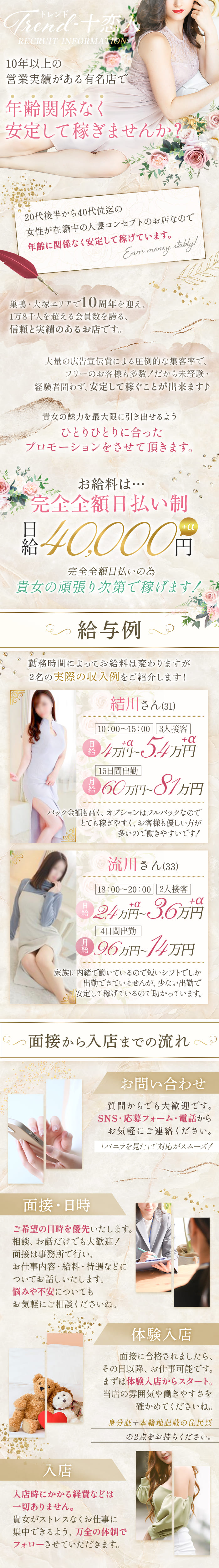 大手グループが経営しているお店だよ。待遇や条件も手厚くて安心だし、集客力もあって女の子が稼ぎやすい!待遇や条件はグループの中でも店舗ごとに変わってくるから、気になるポイントは問い合わせて聞いてみよう♪
