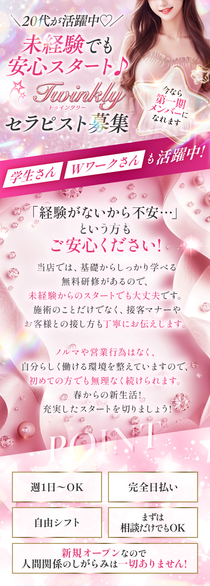 はい、もちろん大丈夫です☺️✨ 当店では未経験からスタートするセラピストさんも多数在籍しています。 いきなり接客ということはありませんのでご安心ください✨ 「私にできるかな…」という不安がある方ほど、しっかりサポートさせていただきます💎