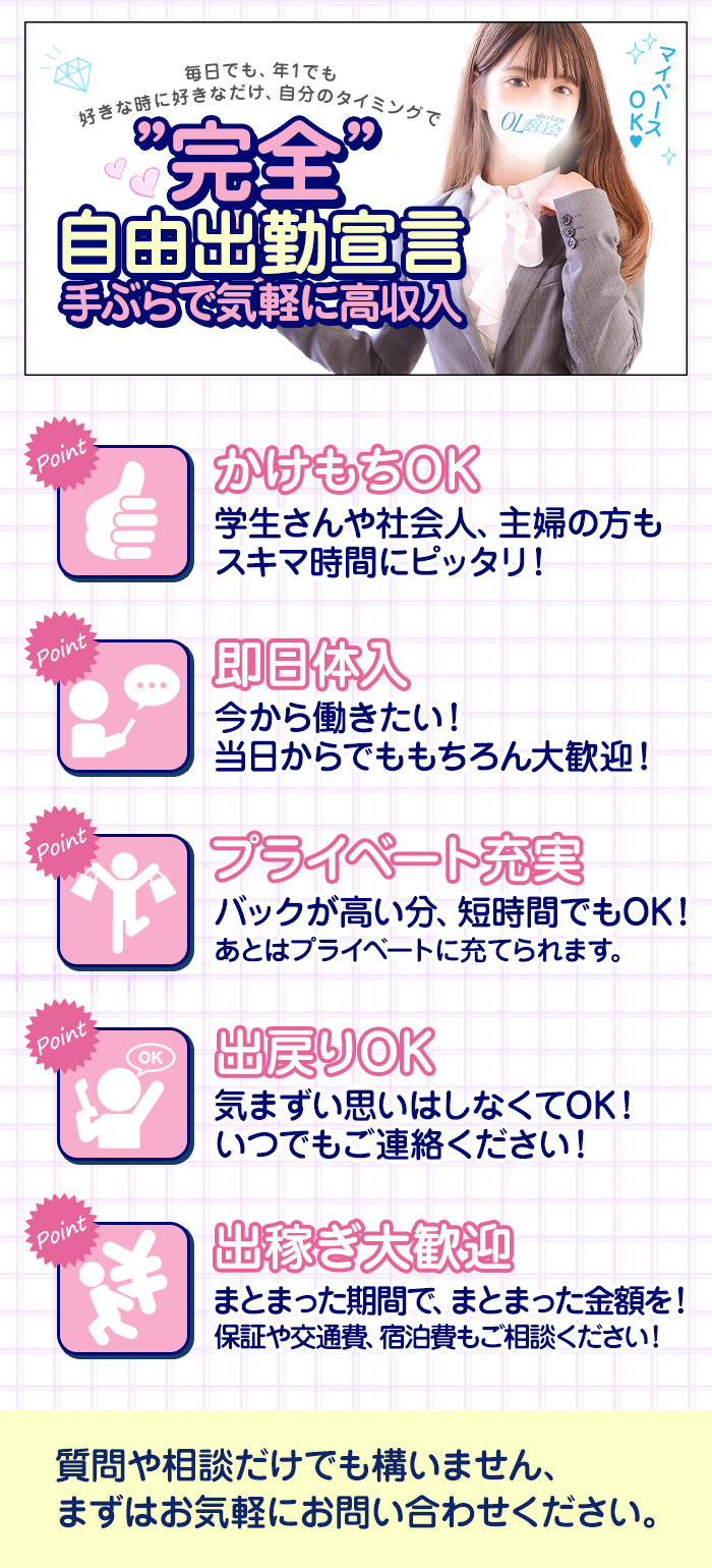 副業やWワークを歓迎しているお店だよ。時間が許す限りガンガン働いていお金を稼ぎたい女の子にはありがたいよね。シフトの入れ方にはお店ごとに決まりがあるから、詳しい条件は問い合わせてみよう♪