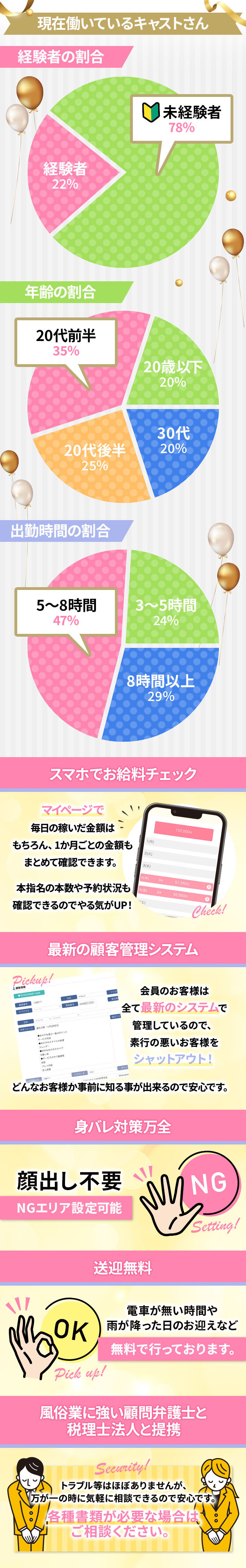 女の子のお仕事に対してノルマや罰金などがないお店だよ♪お店によっては、入店から◯ヶ月以降からはノルマが発生したり、無断欠勤などでは罰金になってしまうなどルールがあったりもするから、入店前にはしっかり聞いてみてね!