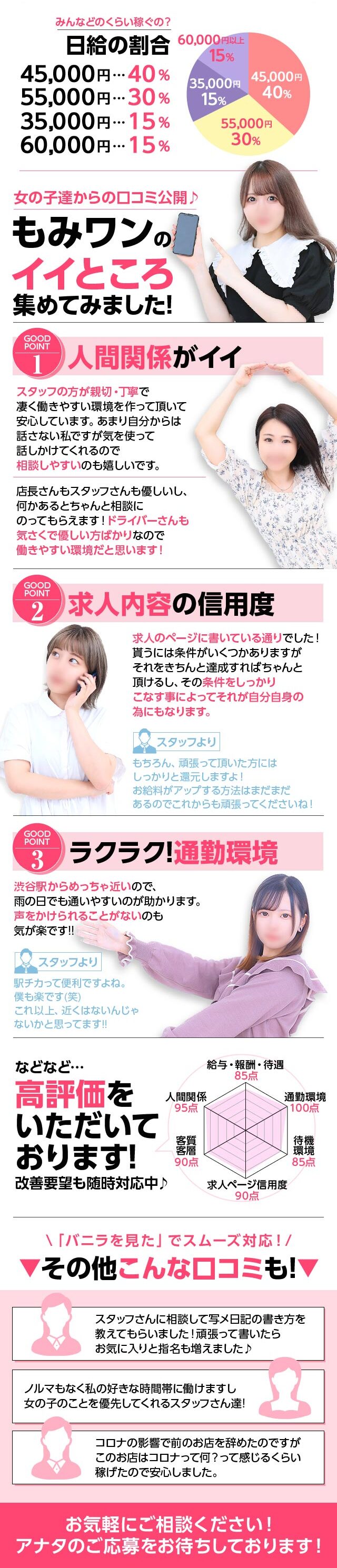 みなさん、こんにちは♪もみもみワンダーランド店長です!本日の記事は業界未経験の方に読んでいただきたいです!82.7%この数字は当グループから業界デビューを果たしたキャストさんの比率!ありがたいことに当グループは多くの未経験の方から応募をいただいております。多い時は、1週間で6人が業界デビューするなんてことも少なくありません。そんな中、僕らスタッフがどうしたら未経験の方が安心安全に稼いでいけるかを経験から学ぶことができました!当店のアピールポイントの一つとして未経験の方へのサポートは他のどのお店にも負けません!!また、都内の繁華街の中でも渋谷は未経験の方がお仕事を始めるのに最適な場所なのです!例えば、池袋!遊ぶお客様の質が悪いということは業界では有名なお話です。お金の余裕もなく、ガツガツしてプレイも粗暴な方が多いです。続いて新宿!ホストの営業、ガラの悪い方夜系のお客様や酔っ払いも多くあまりいいお客様とは言い難いですね。最近ではトー横キッズや立ちんぼそこに群がる方々のおかげで治安の面でも心配です。渋谷は東京の繁華街の中で唯一原宿、青山、代官山、恵比寿中目黒、世田谷区などお洒落で高級なエリアに囲まれています。東京一の高級住宅街も渋谷にあります。ここ最近では再開発も進み、多くの有名企業や有名IT企業からも再注目され事実グーグルなどの一流企業が次々にオフィスを構えています。そんな渋谷で遊ばれるお客様はリッチな方やお洒落な方が多く社会的地位も高いのが特徴です。何より女の子に対して紳士的です。そしてなぜか当グループで遊ばれるお客様は温和な方が多いのも特徴です。上記以外にもメリットがたくさん詰まった渋谷にある当店で安心安全に業界デビューしてみませんか!?スタッフ一同全力でサポートさせていただきます!