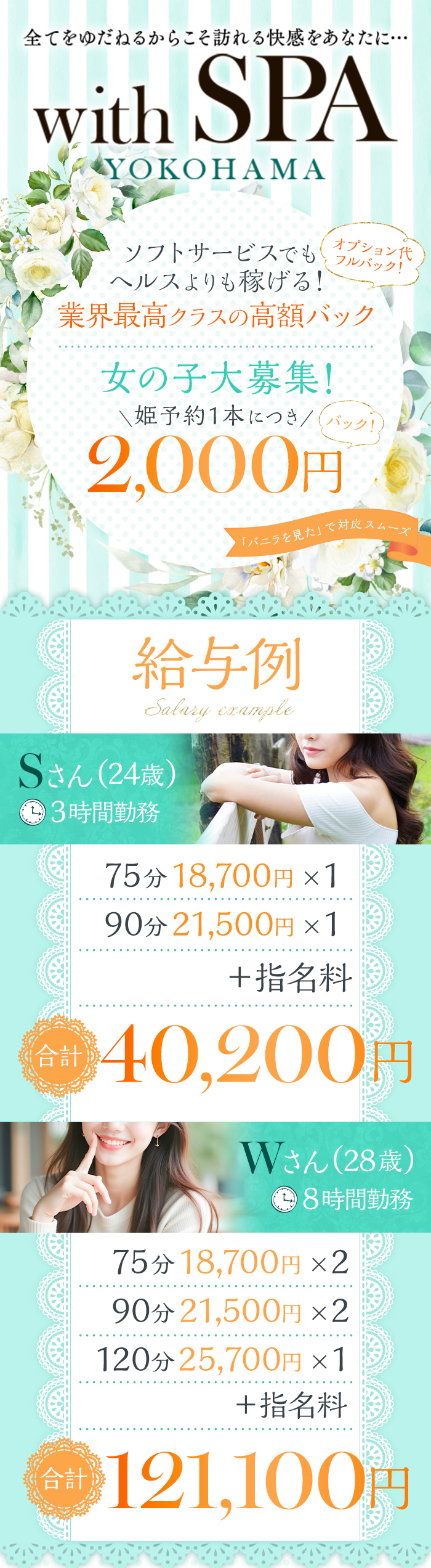お疲れ様です。withSPAです。まだまだ暑い日が続きますがお盆休みも終わり、秋に向けて新しいお店探しはいかがでしょう?【90%の高バック率!】75分¥18,90090分¥22,500+指名料♪姫予約ならさらに1本+¥5,000風俗エステなので受け身にならずにソフトサービスでこのバック★連休で使いすぎてしまった方のお財布をパンパンにさせてください(*'▽')