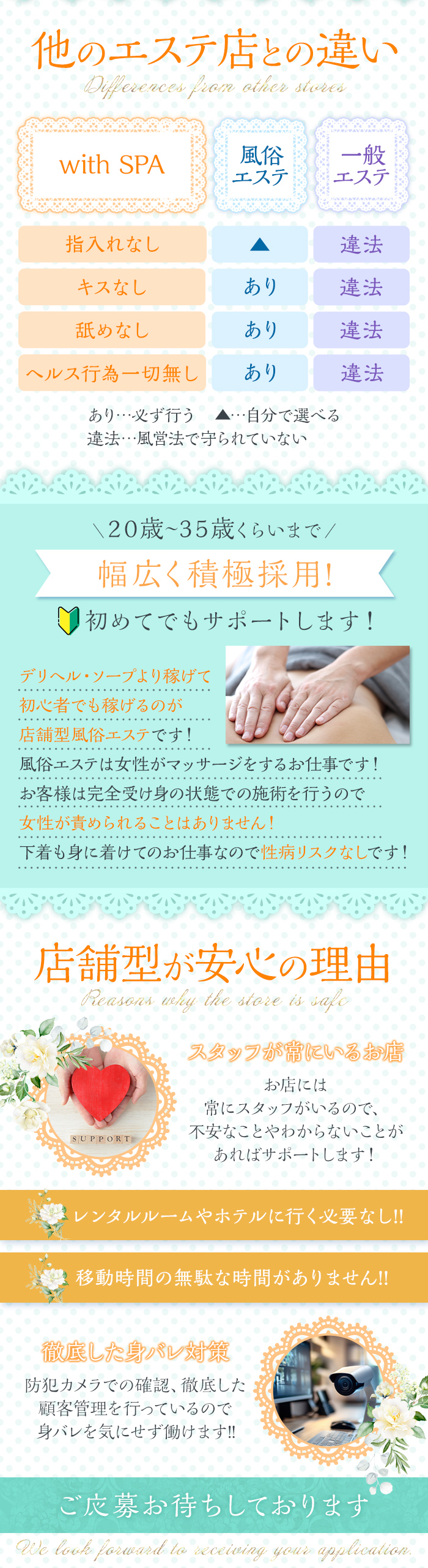 お疲れ様です。withSPAです。8月も沢山のお問合せご応募入店ありがとうございました!9月も沢山のご応募お待ちしております(´▽`*)