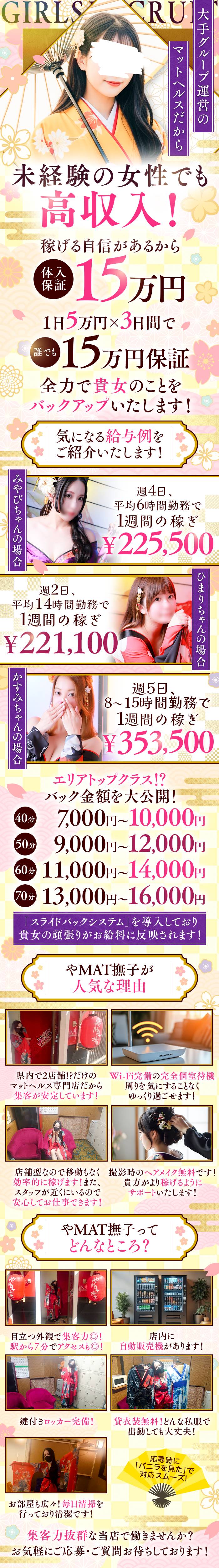 どうも!やMAT撫子スタッフ伊藤です!よくあるご相談のひとつが「本当に未経験でも稼げるんですか?」というもの。結論から言います──「はい!ガチで稼げます!」その理由はズバリ、圧倒的な高バック率にあります!当店では40分バック:7,000円50分バック:9,000円60分バック:11,000円70分バック:13,000円と、業界でもトップクラスの還元率を実現しています。指名バックも+1,000~3,000円つくから、頑張りがちゃんと形になる。ここがポイントです↓↓「未経験でもスタートダッシュが切れるように」→初日からこの高バック!→お客様は受け身メインだから体力的にも安心!→撮影や制服、広告費も全部お店負担!さらに、罰金・ノルマ・強制出勤は一切なし。自分のペースでしっかり稼げる環境が整っています。「生活を変えたい」「借金を返したい」「夢を叶えたい」そんな思いを持った方が、今どんどん入店してきています。未経験から月収100万円以上も全然夢じゃない。気になる方はまず体験入店から!【3日間で15万円保証】があるから、最初の一歩も安心です♪気になったら、ぜひ一度ご連絡ください!