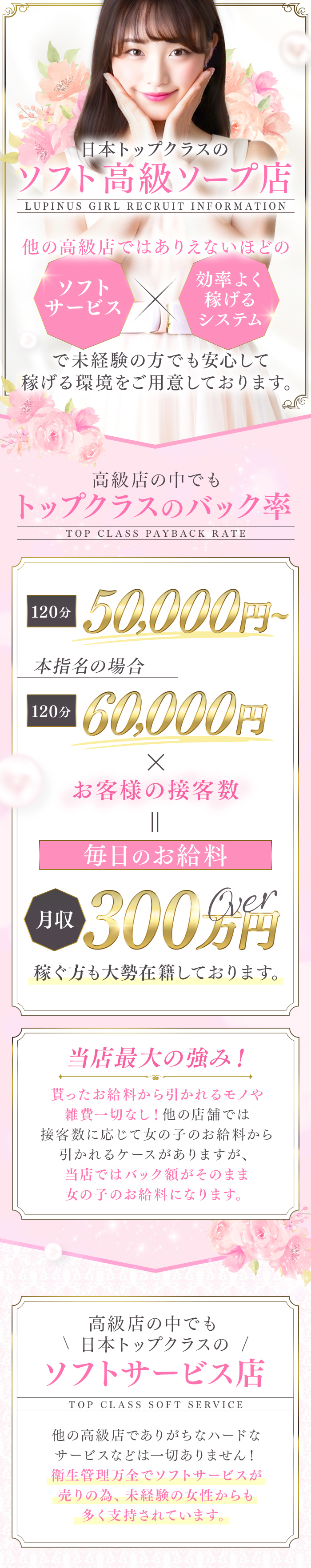 吉原最高級店 ルピナスの姉妹店【ルピナスパルフェ】GRAND OPENです! メンバー大募集です☆ 超高級店グループならではの爆発力!!と驚きの収入!手取り額を体験してください!! 1接客50,000円!本指名60,000円!【引かれるモノなし】 超高級店では異例の速さで翌日デビュー可能です!! 未経験の子が多いので、未経験の子でもすぐに働けるシステムになっています。 今までにない優しい超高級店になっております。 なので経験や自信がなくても、全然大丈夫! 私たちが貴女の隠れた魅力も全部、覚醒させます! 良さを見抜く達人にお任せ下さい!