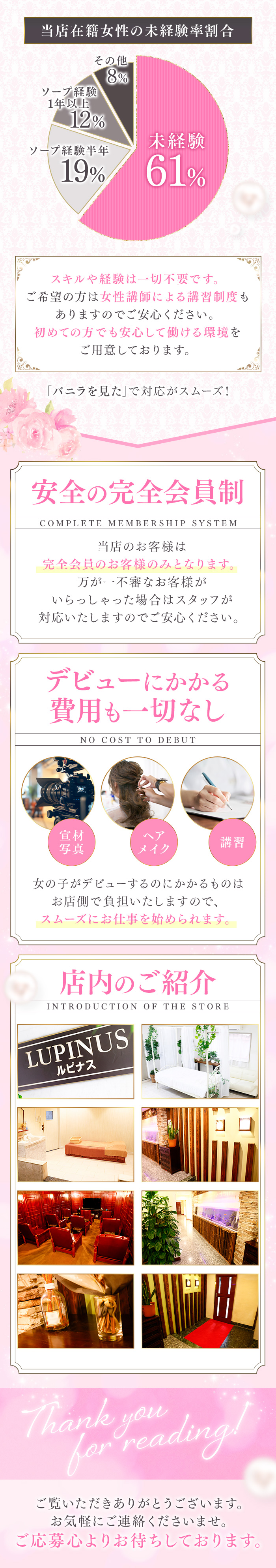 素人専門超高級グループ【ルピナスグループ】 恋人接客が基本なので、 難しいサービスや不潔なサービスなど一切強制致しません♪ 業界トップクラスのソフトサービスを行う超高級店ですので、実技講習等も一切ありません♫ お仕事未経験の方、経験の浅い方でも安心です♪ しかも雑費等は一切ありませんので、お仕事した分すべてが1日の収入になります♪ 専任の女性スタッフもいますので、 男性スタッフには相談しずらいことも気兼ねなく相談していただける環境です! 短期のアルバイト、目標の達成等、いろいろあると思いますが しっかりサポートさせていただきますので、是非一度ご連絡、ご相談いただければと思います。