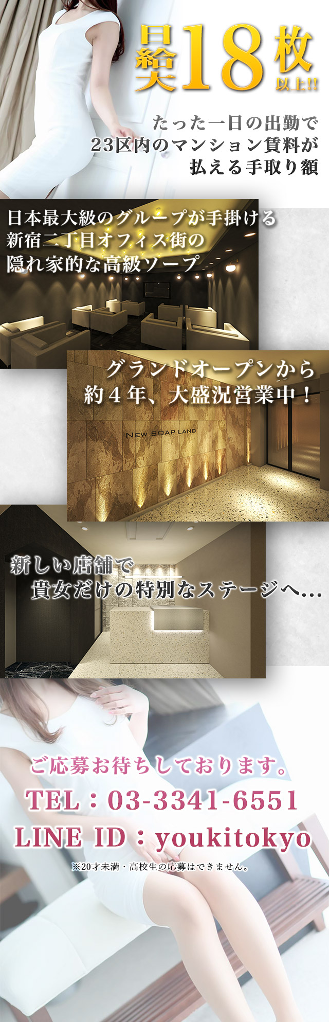 新宿2丁目のオフィス街に日本最大級のソープランドグループがプロデュースする本気の高級店! たった一日の出勤で23区内のマンション賃料が払えてしまう手取り額、大18枚以上可です! ★LINE応募可 角海老グループ女子求人用LINE ID「youkitokyo」で検索