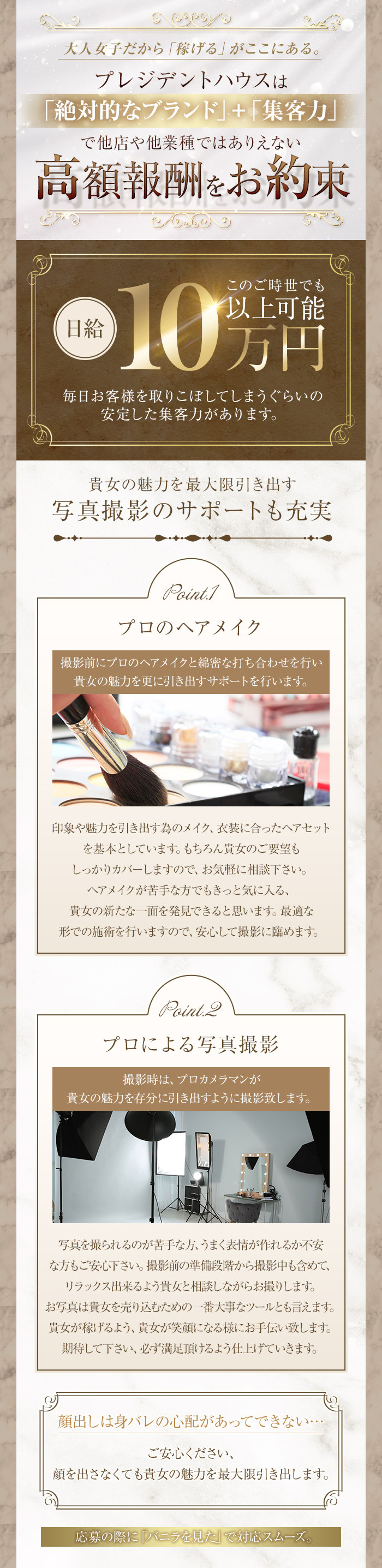 「安定した収入がほしい」「すぐに現金が必要」そんなお悩みをお持ちの方に、当店は最適な環境をご用意しております。プレジデントハウスでは、完全日払い制度を採用しており、その日働いた分はその日のうちにお渡ししています。加えて、吉原エリアでもトップクラスの集客力を誇っており、初日から日給30,000円~10万円以上も珍しくありません。高収入なのに収入の波が少ないのは、安定したお客様層と、リピーター様の多さ、そして4万人以上の会員様に向けて配信されるメルマガの力があるからです。毎日がチャンス。働いたその日が“高収入の日”になります。まずは話を聞くだけでも構いません。お気軽にお問い合わせください。お問合せは「バニラを見た」で!【LINEからのお問合せはこちら】