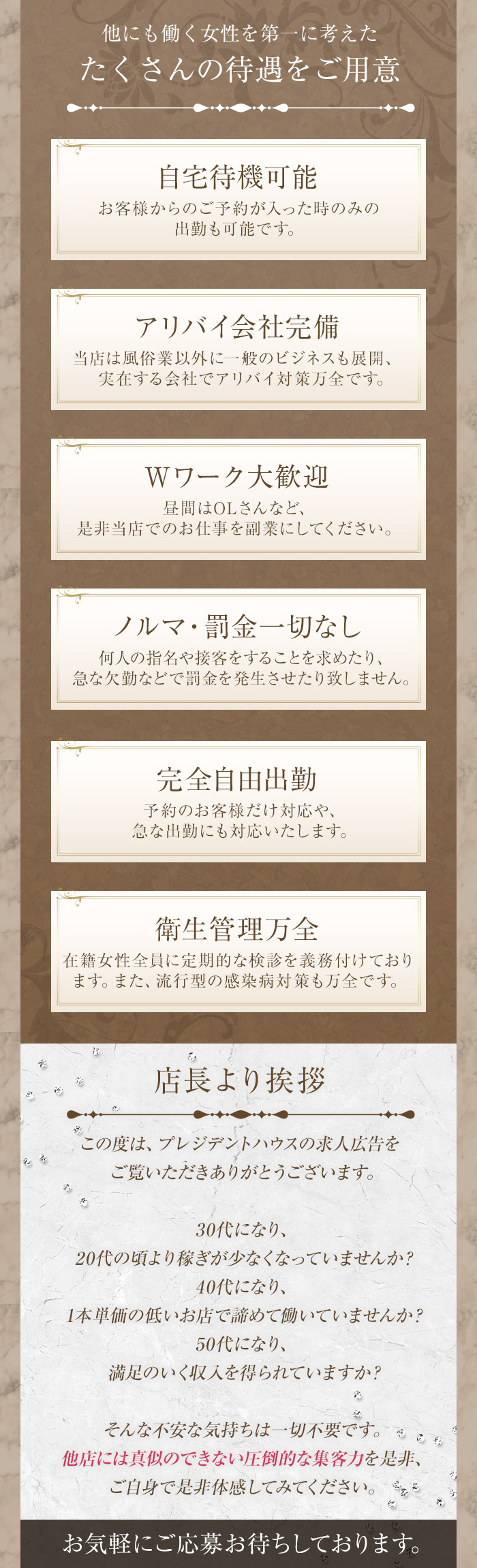 30代になり、20代の頃より稼ぎが少なくなっていませんか?40代になり、1本単価の低いお店で諦めて働いていませんか?50代になり、満足のいく収入を得られていますか?そんな不安な気持ちは一切不要です。女性が稼げるから、当グループも潤います。他店には真似のできない圧倒的な集客力を是非、ご自身で体感してみてください。