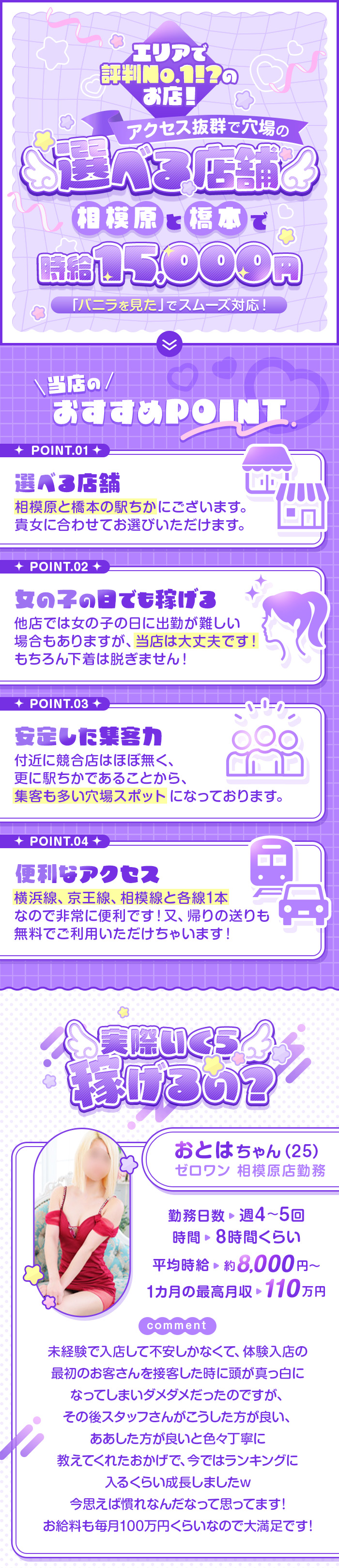 相模原駅からは徒歩1分!未経験でも安心の駅近ピンクサロン!体験入店時のスタッフさんの対応に惹かれて入店した“あいな”さん。10~30代の女の子が在籍し、年齢の近い人が多いので待機中も楽しく過ごすことができているそうです。わからないことがあれば優しくアドバイスをもらえるため、未経験でも安心して働ける環境とのこと。JR相模原駅から徒歩1分の好立地で通勤も楽々!