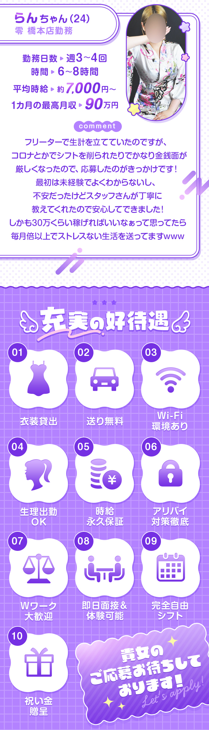 副業やWワークを歓迎しているお店だよ。時間が許す限りガンガン働いていお金を稼ぎたい女の子にはありがたいよね。シフトの入れ方にはお店ごとに決まりがあるから、詳しい条件は問い合わせてみよう♪